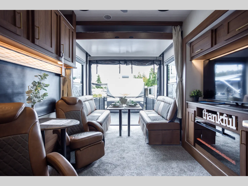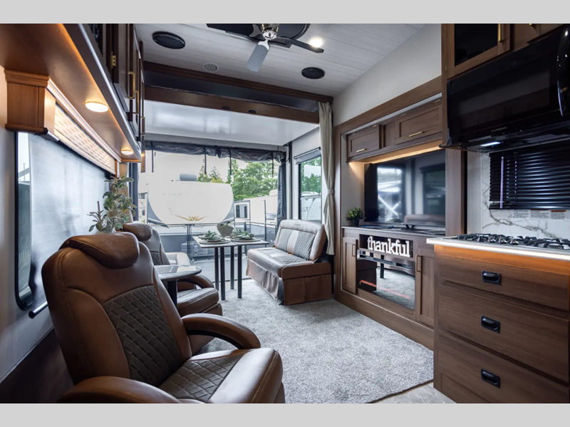 Sleeps 7 Slides 3 Fresh Water Capacity 150 gals Tire Size 16" Generator 6.0 NPS Fuel Capacity 40 gals Number Of Bunks 1 Available Beds King Refrigerator Type 12V Residential Style Refrigerator Size 16 cu ft Shower Size 48" Number of Awnings 1 Garage Size 17 ft LP Tank Capacity 30 lbs Water Heater Type Tankless AC BTU 54000 btu TV Info LR TV Awning Info 10' 10" Electric w/LED Lights Axle Count 2 Washer/Dryer Available Yes Number of LP Tanks 2 Shower Type Standard Electrical Service 50 amp Solar Wattage 200 watts Similar Floorplans