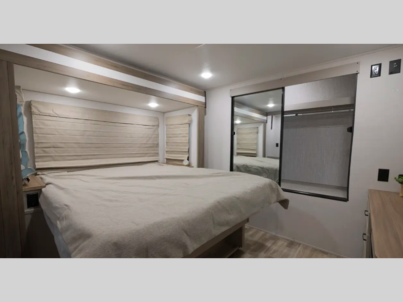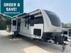 Sleeps 5 Slides 1 Length 34 ft 5 in Ext Width 8 ft Ext Height 11 ft 2 in Int Height 6 ft 8 in Hitch Weight 759 lbs Dry Weight 6891 lbs Cargo Capacity 2668 lbs Fresh Water Capacity 39 gals Grey Water Capacity 64 gals Black Water Capacity 32 gals Available Beds Queen Refrigerator Type Stainless Steel 12 Volt Quick Cool Refrigerator Size 10 cu ft Cooktop Burners 3 Shower Size 36" x 30" Number of Awnings 1 LP Tank Capacity 20 lbs Water Heater Type On Demand Tankless AC BTU 13500 btu TV Info LR LED HD TV Awning Info 20' One Touch Electric with LED Night Light Axle Count 2 Number of LP Tanks 2 Shower Type Walk-In Shower Similar Floorplans