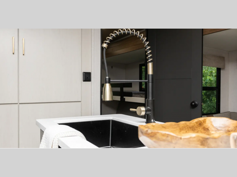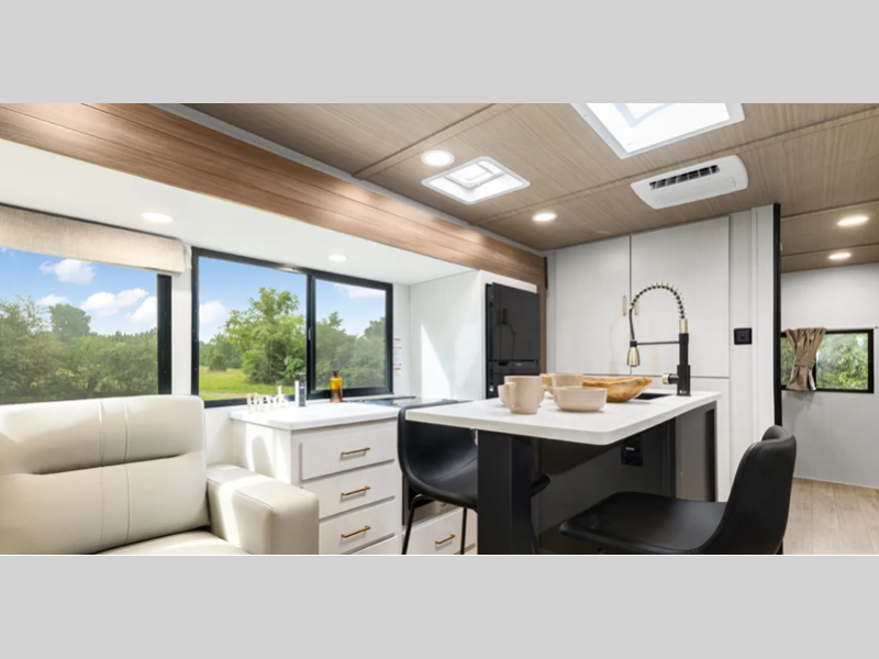 Sleeps 2 Slides 1 Length 29 ft 9 in Ext Width 8 ft Ext Height 11 ft 4 in Hitch Weight 820 lbs Dry Weight 6303 lbs Cargo Capacity 1517 lbs Fresh Water Capacity 38 gals Grey Water Capacity 96 gals Black Water Capacity 30 gals Available Beds Custom King Refrigerator Type 12V Refrigerator Size 10.7 cu ft Cooktop Burners 3 Shower Size 40" x 30" Number of Awnings 1 Water Heater Type On Demand Tankless AC BTU 31500 btu TV Info LR 40" TV Awning Info 18' w/LED Lights Axle Count 2 Shower Type Standard Similar Floorplans