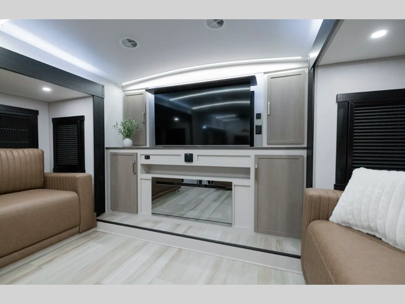 Sleeps 6 Slides 4 Length 43 ft 9 in Ext Width 8 ft Ext Height 13 ft 4 in Hitch Weight 2025 lbs Dry Weight 12924 lbs Cargo Capacity 2546 lbs Fresh Water Capacity 57 gals Grey Water Capacity 91 gals Black Water Capacity 91 gals Available Beds King Refrigerator Type 12V Refrigerator Size 20 cu ft Number of Awnings 1 Water Heater Type Tankless AC BTU 15000 btu TV Info LR 55" Pop-Up TV, Exterior 32" TV Awning Info 20' Electric w/LED Light Axle Count 2 Washer/Dryer Available Yes Shower Type Walk-In Shower Electrical Service 50 amp Similar Floorplans