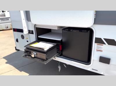 Enjoy your surroundings with plenty of windows in this spacious travel trailer. The rear kitchen features a wrap-around counter space including a double sink and cook-top with an overhead microwave oven. There are bar stools for dining inside along the rear counter, and an L-shaped chaise lounge for additional seating in the open living area. Here, behind the entertainment center, is a multi-purpose space hidden behind the wall insert with a fireplace including a hinged top mattress above a lower bunk, a desk beneath the mattress if you need office space during the day, along with storage cubbies for your things. All of this is within the Versa-Slide that also houses an oversized refrigerator for all of your perishables. The front private bedroom features a custom king bed with Versa-Tilt with a closet for clothes, plus overhead storage for books. This unit also includes an exterior camp kitchen for a sunrise breakfast!