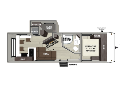 Sleeps 6 Slides 1 Length 29 ft 11 in Ext Width 8 ft Hitch Weight 640 lbs Dry Weight 6158 lbs Cargo Capacity 1482 lbs Fresh Water Capacity 44 gals Grey Water Capacity 60 gals Black Water Capacity 30 gals Number Of Bunks 2 Available Beds Custom King with Versa-Tilt Refrigerator Type Oversized Number of Awnings 1 Water Heater Type Tankless AC BTU 15000 btu Awning Info 18' with 4K Blade Lighting Axle Count 2 Shower Type Radius Electrical Service 50 amp Similar Travel Trailer Floorplans