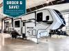 Sleeps 6 Slides 2 Length 35 ft 6 in Ext Width 8 ft 4 in Ext Height 13 ft 6 in Int Height 8 ft 7 in Hitch Weight 2638 lbs GVWR 18000 lbs Dry Weight 12603 lbs Fresh Water Capacity 140 gals Grey Water Capacity 104 gals Black Water Capacity 52 gals Tire Size 17.5" Furnace BTU 35000 btu Fuel Capacity 60 gals Available Beds Queen Refrigerator Type Stainless Steel Refrigerator Size 15 cu ft Cooktop Burners 3 Shower Size 48" x 30" Number of Awnings 2 Axle Weight 8000 lbs Garage Size 15 ft LP Tank Capacity 30 lbs Water Heater Type Tankless AC BTU 30000 btu TV Info LR LED Smart TV Awning Info 14' and 16' w/LED Accent Lighting Axle Count 2 Washer/Dryer Available Yes Number of LP Tanks 2 Shower Type Walk-In Shower Electrical Service 50 amp Similar Floorplans