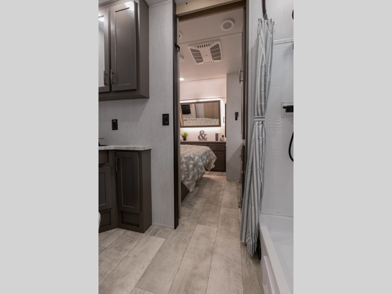 Each model also includes a universal docking center, a fiberglass front cap with paint and LED lighting, a heated and enclosed underbelly for four seasons of traveling, and a dovetail rear end. The Momentum G-Class also comes with large panoramic windows, residential cabinetry, motion-sensor lighting, and stainless steel-accented appliances. The fun will not stop when listening to the exterior speakers, and the awning with LED lighting will create an outdoor living space you are sure to love.