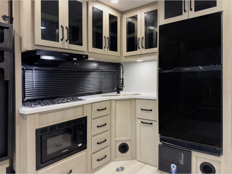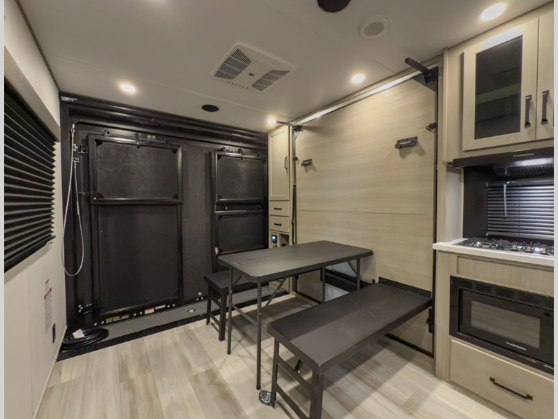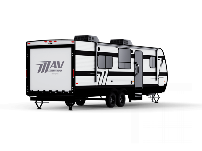 MAV stands for Momentum Adventure Vehicle, and you will surely have grand adventures in this one. The Strong Wall aluminum construction is 25% thicker than the competition and the double insulated roof is ultra durable. Thoughtful design touches make life easier, like the magnetic storage door catches and the lack of wheel wells in the garage, which gives you full use of the cargo area. Inside you'll find solid hardwood drawer fronts, residential countertops, and a solid bedroom door. The Solar Package provides off-grid capabilities with a 180W solar panel, 12V refrigerator, battery monitor, and 40 Amp charge controller with Bluetooth!