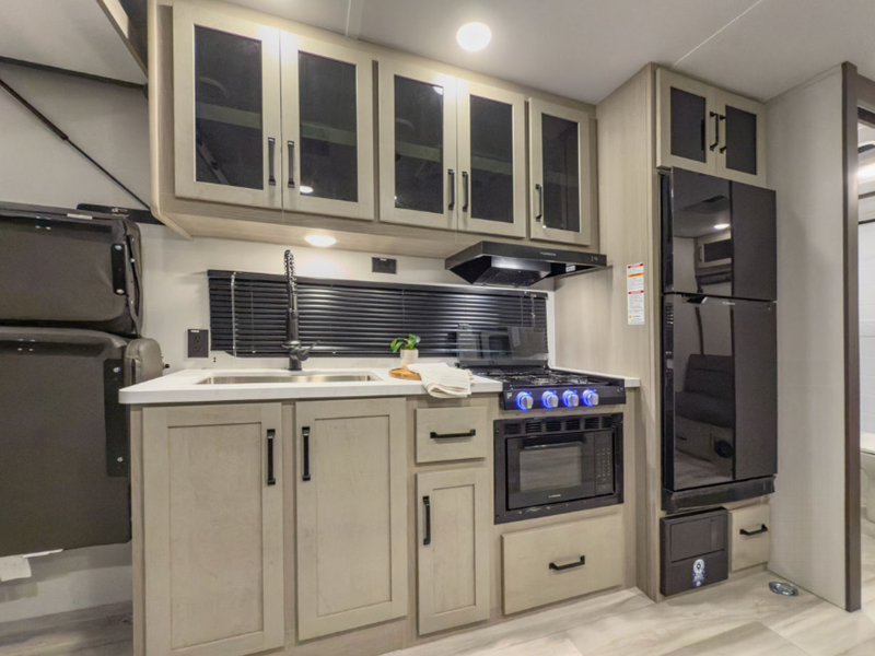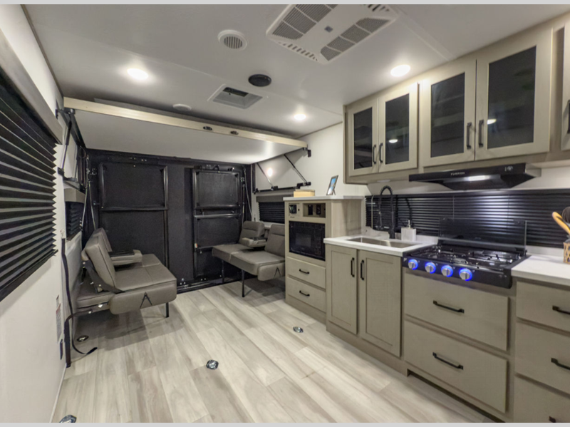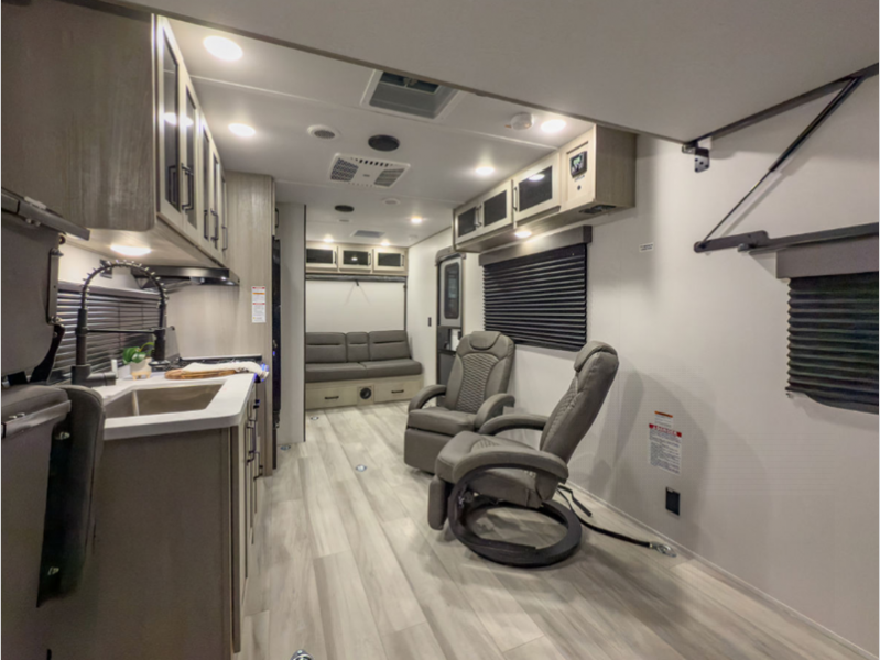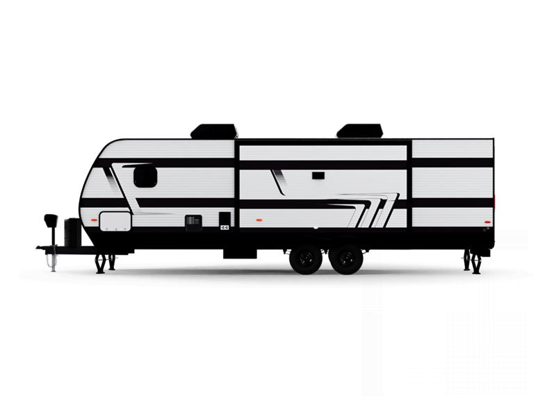 Sleeps 5 Length 26 ft 6 in Ext Width 8 ft 4 in Ext Height 12 ft 2 in Int Height 7 ft Hitch Weight 915 lbs GVWR 9950 lbs Dry Weight 5600 lbs Fresh Water Capacity 90 gals Grey Water Capacity 74 gals Black Water Capacity 37 gals Tire Size ST225/75R15LRE Furnace BTU 30000 btu Number Of Bunks 1 Available Beds Queen Murphy Refrigerator Type 12V Refrigerator Size 8 cu ft Cooktop Burners 3 Shower Size 24" x 32" Number of Awnings 1 Garage Size 13 ft 6 in LP Tank Capacity 20 lbs Water Heater Type Tankless AC BTU 15000 btu Awning Info 17' Power Axle Count 2 Number of LP Tanks 2 Shower Type Walk-In Shower Similar Floorplans