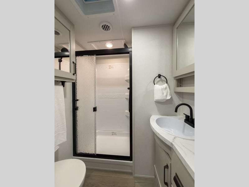 Each fifth wheel has 90-degre turning radius capabilities which allows you to be comfortable driving in town and parking into your campsite. Some construction and Arctic 4-Seasons Protection package features include a one-piece TPO roof membrane, a heated and enclosed underbelly with circulating heat, 12V heat pads on the holding tanks, and a heated pass-through storage area so you can travel and enjoy any climate. The interior offers large panoramic slide room windows for great views, premium Congoleum flooring for durability, and an On Demand water heater.