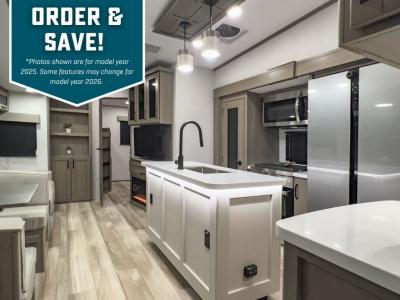 Are you looking to travel with your family and friends and want enough space for everyone to be comfortable? Step inside using the Step Above wit lift assist entry steps, to find a private bunkhouse in the rear of this fifth wheel which offers a slide out flip bunk above a tri-fold sofa, a 44" bunk bed with window and storage below, plus its very own private half bathroom. The theater seating or tri-fold sofa option is a great place to unwind at night in front of the entertainment center with a 40" LED HDTV and fireplace below it. There is a booth dinette or you can a swivel dinette option to dine at, and the kitchen island will provide more counter space to prep meals. You will find full amenities including a 16 cu. ft. 12V refrigerator and a hutch. This fifth wheel also includes a double entry bathroom with a radius shower, and you can wake up refreshed each morning after sleeping on your own queen bed.