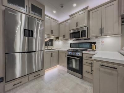 Each is built on a 101" wide body drop-frame super chassis, and includes the MORryde pin box system that utilizes a unique rubber shear spring to positively deal with rough towing and road shock. Some standard features that stand out include the chef-inspired professional grade stainless steel cooktop and Smart sink with a removeable cutting board, produce strainer and glass rinser, and the on-demand water heater with a whole house water filtration system. There is also an all-in-one enclosed and heated utility center to enjoy four seasons of camping, plus many more comforts.