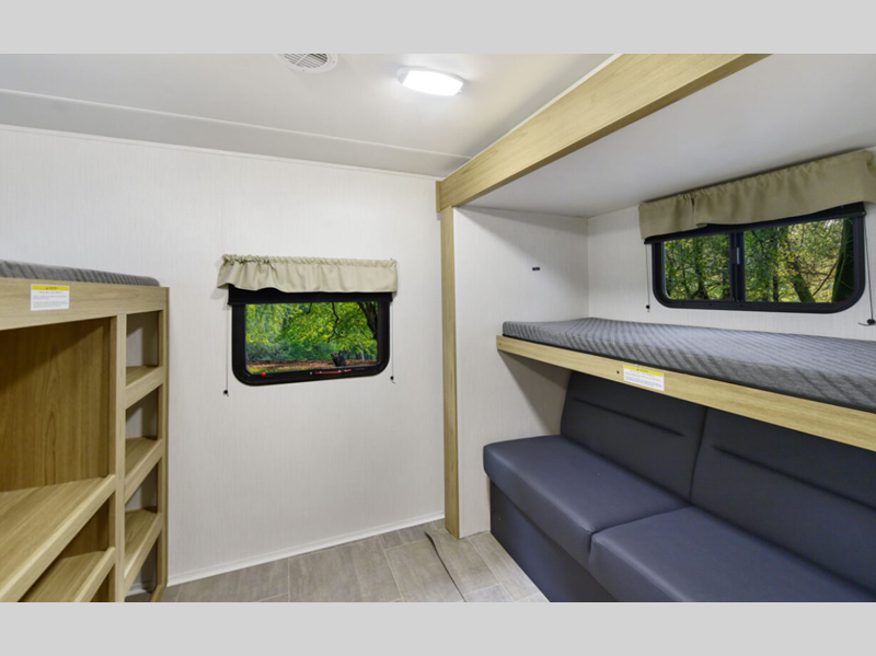 Sleeps 6 Ext Width 8 ft Fresh Water Capacity 30 gals Grey Water Capacity 20 gals Black Water Capacity 20 gals Furnace BTU 19000 btu Number Of Bunks 2 Available Beds Queen Refrigerator Type 12V Cooktop Burners 2 Shower Size 40" Number of Awnings 1 LP Tank Capacity 20 lbs Water Heater Type On Demand Tankless Awning Info 13' Power Axle Count 1 Number of LP Tanks 1 Shower Type Standard Electrical Service 30 amp Similar Floorplans