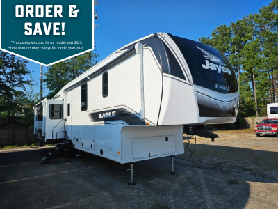 With any Eagle fifth wheel by Jayco you will appreciate durable construction materials, like the Magnum Truss Roof and the Stronghold VBL laminated walls. The JAYCOMMAND Smart RV system puts you in control of your RV's functions, and the 5 Star Handling Package will provide smooth towing from home to camp. Each model features Climate Shield zero-degree tested weather protection and the industry-exclusive HELIX cooling system that features two 15,000 BTU Whisper Quiet A/C's to keep you comfortable year around. Some of the exterior conveniences you are sure to love are the pass-through storage with Slam-Latch baggage doors and an automotive style front cap with max turn radius. The Eagle fifth wheels are designed to make you feel at home with solid hardwood slide fascia, residential vinyl flooring throughout, 100% no floor vents, and blackout roller shades with reflective side throughout for added privacy and insulation.