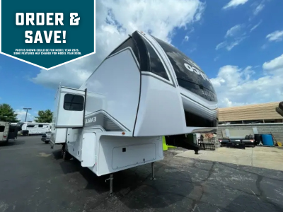 Enjoy a private bedroom suite in this fifth wheel! The king bed is positioned in a slide out for maximum room, and a sliding door leads to the front bath which is full of luxurious features. Enjoy a 30" x 60" shower. There's also a walk-in front closet which has washer and dryer prep if you want to add those appliances. You'll love the living area with its theater seats, tri-fold sofa, ceiling fan, and entertainment center with fireplace. The kitchen has a three burner cooktop, center island with a multi-functional sink, 30" microwave oven over the range, and a 16 cu. ft. 12 volt refrigerator - perfect for cooking up great meals. And the additional overhead storage over the half bath will be perfect for luggage!