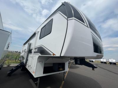 Sleeps 8 Slides 1 Length 34 ft 8 in Ext Width 8 ft Ext Height 13 ft Int Height 8 ft 5 in Interior Color Calli Linen Hitch Weight 1770 lbs GVWR 10750 lbs Dry Weight 8995 lbs Cargo Capacity 1755 lbs Fresh Water Capacity 52 gals Grey Water Capacity 82 gals Black Water Capacity 45 gals Tire Size ST225/75R15E Furnace BTU 35000 btu Number Of Bunks 2 Available Beds Olympic Queen Refrigerator Type GE 12V Refrigerator Size 10 cu ft Shower Size 30" x 36" Number of Awnings 1 LP Tank Capacity 30 lbs Water Heater Type On Demand AC BTU 15000 btu TV Info LR 4K Ultra LED HD Smart TV Awning Info 19' Electric w/Integrated LED Lights Axle Count 2 Washer/Dryer Available Yes Number of LP Tanks 2 Shower Type Standard Electrical Service 50 amp Similar Fifth Wheel Floorplans