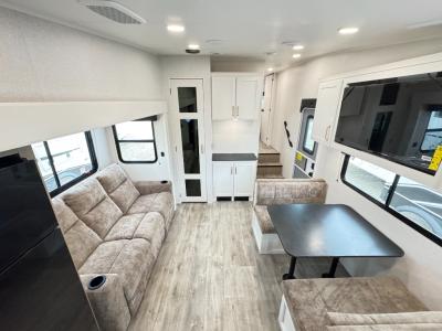 Camping just got a whole lot sweeter in this fifth wheel with double slides, a rear kitchen, and sleeping space for five to six. You'll love waking up each morning in the front private bedroom that includes a queen bed, dual nightstands and overhead cabinets, plus a wardrobe and dresser slide. Your guests who slept on the tri-fold sofa and booth dinette can convert these back to seating space in the morning, and breakfast can be made in the rear kitchen. Here, you'll find ample counter space, a microwave and range, plus a pantry and 12V refrigerator for food storage. Outside, gear can be stored in the pass-thru storage area, and you're sure to enjoy the 16' power awning with LED Lights!
