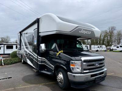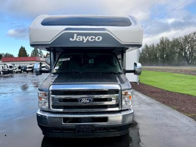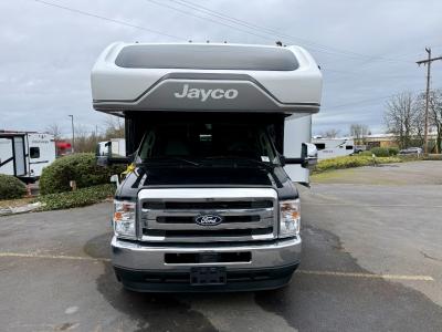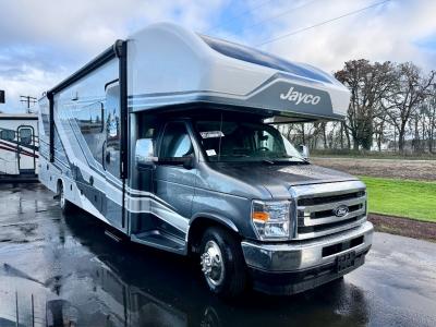 With any Greyhawk Class C gas motorhome by Jayco you will experience smooth sailing thanks to the JRIDE PLUS that comes with Koni shock absorbers, a computer-balanced driveshaft, Hellwig helper springs, and more. The Ford E-450 chassis with a 7.3L V8 325 HP engine will power your excursions, and you'll appreciate the added safety features for your peace of mind. Each model features a Sony infotainment center with Apple CarPlay and Android Auto, backup and side-view cameras, and a tire pressure monitor system the driver is sure to appreciate. Durable construction begins with Stronghold VBL roof, floor and sidewalls, bead-foam insulation, and a one-piece seamless fiberglass front cap. Head inside to find blackout night roller shades, LED-lit pressed countertops, an 84" interior ceiling height, and hardwood cabinet doors and drawers.