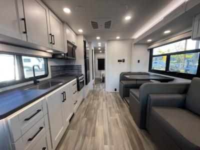 Sleeps 6 Slides 2 Length 32 ft 6 in Ext Width 8 ft 4 in Ext Height 11 ft 8 in Int Height 7 ft Interior Color Modern Farmhouse, Oakridge Exterior Color Standard Graphics, Full-Body Paint: Spring, Summer, Fall, Winter, Midnight Hitch Weight 7500 lbs GVWR 14500 lbs Fresh Water Capacity 47 gals Grey Water Capacity 41 gals Black Water Capacity 32 gals Tire Size LR225/75R16E Furnace BTU 30000 btu Generator 4000 Watt Fuel Type Gas Engine 7.3L V8 Chassis Ford E-450 Horsepower 325 hp Fuel Capacity 55 gals Wheelbase 223 in Number Of Bunks 1 Available Beds Queen Torque 450 ft-lb Refrigerator Type 12 Refrigerator Size 10 cu ft Cooktop Burners 3 Shower Size 30" x 36" Number of Awnings 1 LP Tank Capacity 16.5 gals Water Heater Capacity 6 gal Water Heater Type Gas/Electric DSI AC BTU 15000 btu Basement Storage 55 cu. ft. TV Info LR LED HD Smart TV Awning Info 16' Electric with LED Lights Gross Combined Weight 22000 lbs Shower Type Standard Electrical Service 30 amp Solar Wattage 200 watts Similar Motor Home Class C Floorplans