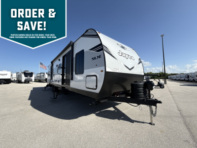 The Jayco Jay Flight SLX travel trailer is quite easy to own because it is lightweight for an easier towing experience. Built on a fully integrated A-frame with galvanized-steel, impact-resistant wheel wells, the Jay Flight SLX has quality at its very foundation. That quality continues on to the electric self-adjusting brakes, easy-lube hubs, Magnum Truss roof system, and LP quick connect. Some of what the mandatory Customer Value Package includes is backup camera prep, Keyed-Alike entry and baggage doors, and an on-demand tankless water heater.