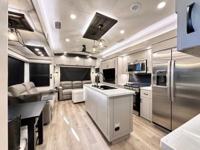 Whether you want to live in this fifth wheel or travel for long periods at a time, you will enjoy the spacious main living and kitchen area with dual slide outs as well as the bedroom with a slide out king bed. You will also find drawers with hamper and prepped space for a washer/dryer option, and a flip-top dresser with 32" TV. Easily get cleaned up in the full bathroom which also has linen storage. The cook will have a residential refrigerator to store all the cold items and beverages, a kitchen island, a pantry and a residential 24" stove. The 4K Smart LED HDTV with fully digital HDMI output and home entertainment system with subwoofer and fireplace below will provide a cozy place to watch your shows while relaxing on the theater seats, the tri-fold sofa, or the roll-top dinette table.