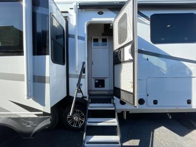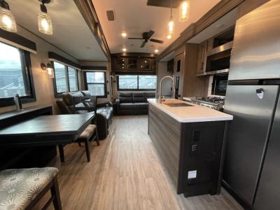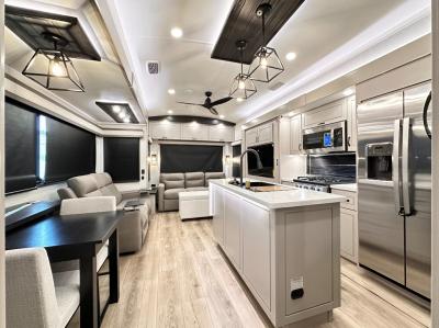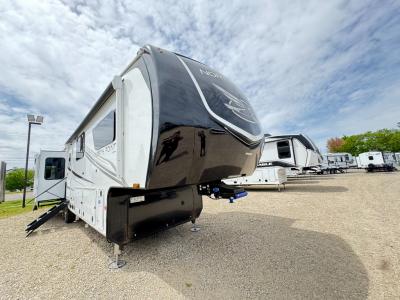 Sleeps 9 Slides 4 Length 42 ft 11 in Ext Width 8 ft 6 in Ext Height 13 ft 4 in Int Height 8 ft 6 in Interior Color Dune Gray Hitch Weight 2800 lbs GVWR 18100 lbs Dry Weight 15560 lbs Cargo Capacity 2540 lbs Fresh Water Capacity 75 gals Grey Water Capacity 87 gals Black Water Capacity 50 gals Tire Size 215/75R17.5"H Furnace BTU 40000 btu Number Of Bunks 1 Available Beds King Refrigerator Type GE Residential Refrigerator Size 21 cu ft Cooktop Burners 4 Number of Awnings 2 LP Tank Capacity 40 lbs. Water Heater Type On Demand Tankless AC BTU 30000 btu TV Info LR 4K Smart LED HDTV, BR 32" 4K Smart TV Awning Info 11' and 20' Electric with Integrated LED Lights Axle Count 2 Washer/Dryer Available Yes Number of LP Tanks 3 Shower Type Shower w/Seat Similar Fifth Wheel Floorplans