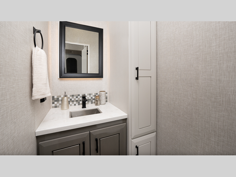 Step inside and find Residential, solid-surface kitchen and bathroom countertops paired with solid hardwood cabinetry, (made in USA) vinyl flooring, and LED accent lighting above the slide outs. You will appreciate the 102" wide body construction creating open living spaces, and each model includes a pass-through storage with Slam-Latch baggage doors so nothing needs to be left behind.
