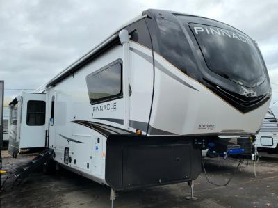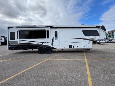 Each Pinnacle fifth wheel features Stronghold VBL lamination for the lightest, yet strongest construction in the RV industry. Add that to the Magnum Truss XL6 roof system and Climate Shield zero-degree tested weather protection and you'll be enjoying your fifth wheel even in harsh weather. Some of the exterior conveniences you will appreciate are the Keyed-Alike lock system, the fully enclosed, universal docking center, and the 6-point hydraulic auto-leveling system for quick and easy set up. The 5 Star Handling Package will make towing a fifth wheel a walk in the park, and the two Whisper Quiet A/C units will keep you comfortable during the hot summer months. Inside, you'll enjoy the residential "Do it all" sink, the solid hardwood cabinet doors, stiles, and fascia, the vinyl flooring throughout, plus many more comforts. There is even a central vacuum system, a wireless remote-control system, 12V charging station, plus many more conveniences to make each trip enjoyable.