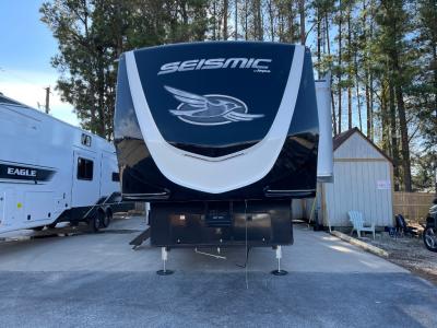 Take your outdoor adventures up a notch with this Seismic toy hauler. You can take the whole gang along for some fun with triple slides and dual entry for easy access going in and out. Your friends will sleep comfortably on the convertible sofas with overhead queen bed above in the 14' cargo garage space. There is also a storage space/loft above for their things and additional sleeping if needed. Inside, a full bath can be shared by all to get cleaned up each day, and all can gather inside in the spacious living area featuring dual opposing slides. Theater seating and an L-shaped tri-fold sofa create plenty of space for lounging. There is also a dining table for four inside and the second table in the garage area allows for more seating during meals inside when the weather isn't that nice. Two side awnings provide protection from the elements, along with a rear awning, and the rear ramp party deck with steps create even more outdoor living space to enjoy!