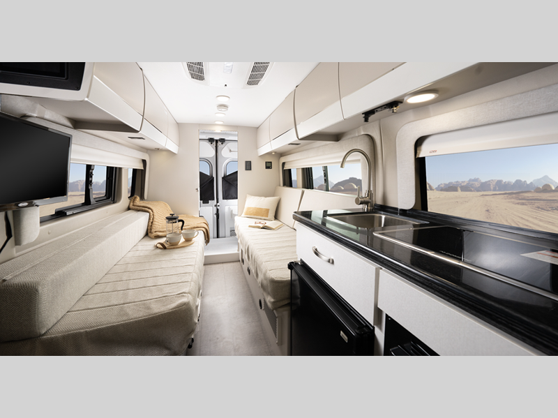 Sleeps 2 Length 20 ft 11 in Ext Width 6 ft 11 in Ext Height 9 ft 3 in Int Height 6 ft 2 in Interior Color Caribou Exterior Color Granite, Silver Hitch Weight 3500 lbs GVWR 9350 lbs Fresh Water Capacity 24 gals Grey Water Capacity 13 gals Black Water Capacity 12 gals Tire Size LT225/75R16E Furnace BTU 20000 btu Generator 2,800-watt Onan Fuel Type Gasoline Engine 3.6L V6 24V VVT Chassis Ram ProMaster 3500 Van Horsepower 276 hp Fuel Capacity 24 gals Wheelbase 159 in Available Beds Two Twin with King Conversion Torque 250 ft-lb Refrigerator Type DC Refrigerator Size 3.1 cu ft Convection Cooking Yes Cooktop Burners 2 Shower Size 25" x 43" Number of Awnings 1 LP Tank Capacity 20 lbs Water Heater Type Truma Combi Eco Plus AC BTU 13500 btu Awning Info 13' Thule Armless w/LED Light Strip Gross Combined Weight 12000 lbs Shower Type Wet/Bath Shower Electrical Service 30 amp Similar Floorplans