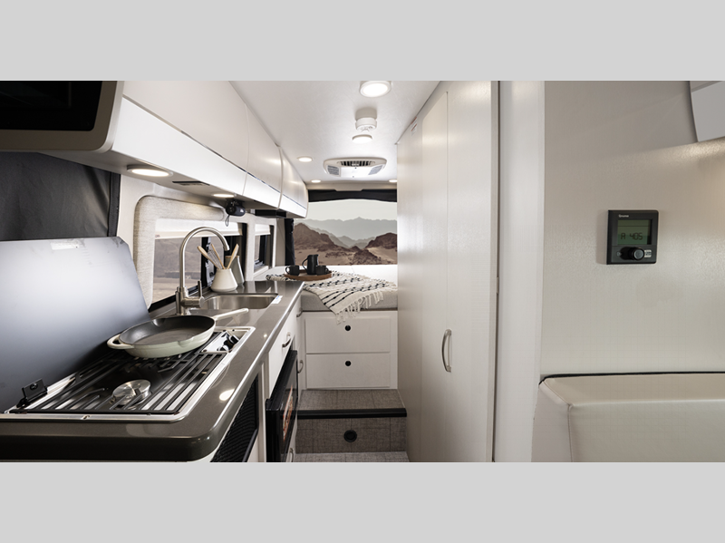 Sleeps 2 Length 20 ft 11 in Ext Width 6 ft 11 in Ext Height 9 ft 3 in Int Height 6 ft 2 in Interior Color Caribou Exterior Color Granite, Silver Hitch Weight 3500 lbs GVWR 9350 lbs Fresh Water Capacity 21 gals Grey Water Capacity 20 gals Black Water Capacity 10 gals Tire Size LT225/75R16E Furnace BTU 20000 btu Generator 2,800-watt Onan Fuel Type Gasoline Engine 3.6L V6 24V VVT Chassis Ram ProMaster 3500 Van Horsepower 276 hp Fuel Capacity 24 gals Wheelbase 159 in Available Beds Murphy Torque 250 ft-lb Refrigerator Type DC Refrigerator Size 3 cu ft Convection Cooking Yes Cooktop Burners 2 Shower Size 25" x 46.25" Number of Awnings 1 LP Tank Capacity 20 lbs Water Heater Type Truma Combi Eco Plus AC BTU 13500 btu Awning Info 13' Thule Armless w/LED Light Strip Gross Combined Weight 12000 lbs Shower Type Wet/Bath Shower Electrical Service 30 amp Similar Floorplans