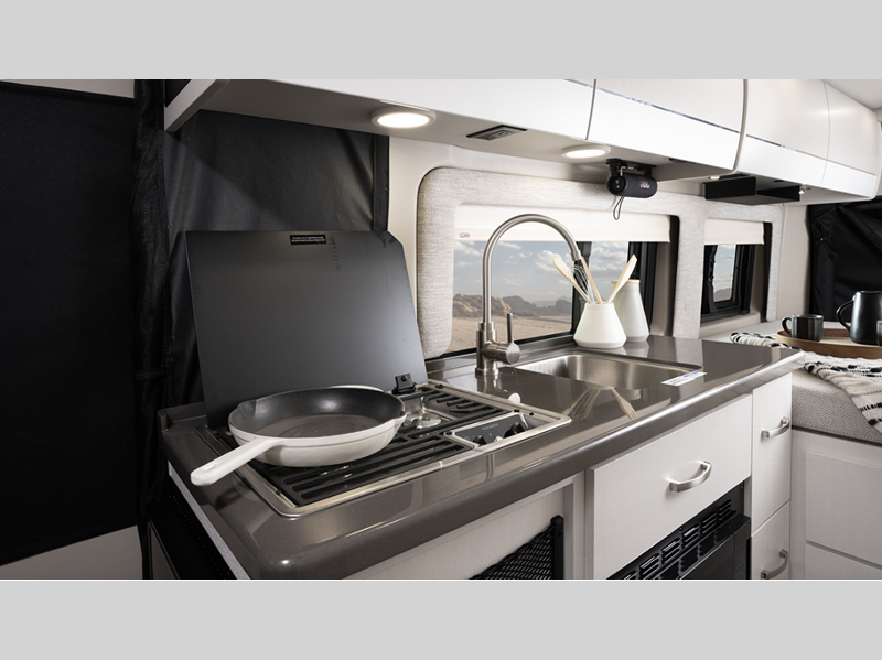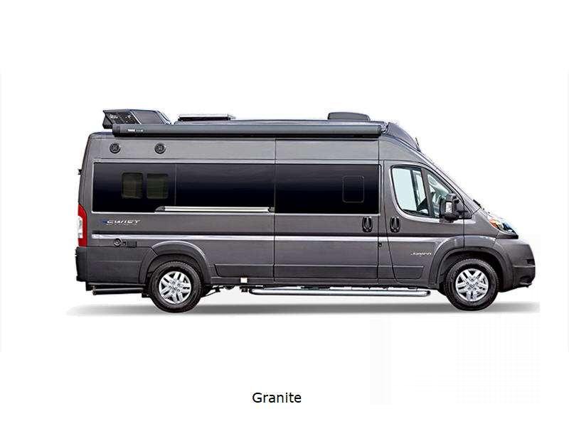Sleeps 2 Length 20 ft 11 in Ext Width 6 ft 11 in Ext Height 9 ft 3 in Int Height 6 ft 2 in Interior Color Caribou Exterior Color Granite, Silver Hitch Weight 3500 lbs GVWR 9350 lbs Fresh Water Capacity 21 gals Grey Water Capacity 20 gals Black Water Capacity 10 gals Tire Size LT225/75R16E Furnace BTU 20000 btu Generator 2,800-watt Onan Fuel Type Gasoline Engine 3.6L V6 24V VVT Chassis Ram ProMaster 3500 Van Horsepower 276 hp Fuel Capacity 24 gals Wheelbase 159 in Available Beds Loft Bed Torque 250 ft-lb Refrigerator Type DC Refrigerator Size 3 cu ft Convection Cooking Yes Cooktop Burners 2 Shower Size 25" x 46.25" Number of Awnings 1 LP Tank Capacity 20 lbs Water Heater Type Truma Combi Eco Plus AC BTU 13500 btu Awning Info 13' Thule Armless w/LED Light Strip Gross Combined Weight 12000 lbs Shower Type Wet/Bath Shower Electrical Service 30 amp