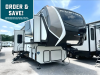 Sleeps 4 Slides 3 Length 37 ft 3 in Ext Width 8 ft 4 in Ext Height 13 ft 3 in Interior Color Lodge, Dovetail Exterior Color Blue Slate Full Body Paint, Copper Mist, Frost Black Hitch Weight 2560 lbs Dry Weight 13585 lbs Cargo Capacity 2915 lbs Fresh Water Capacity 75 gals Grey Water Capacity 83 gals Black Water Capacity 49 gals Tire Size 215/75R17.5H Furnace BTU 35000 btu Available Beds King Refrigerator Type Residential with Ice Maker Refrigerator Size 18 cu ft Convection Cooking Yes Cooktop Burners 3 Number of Awnings 2 Axle Weight 7000 lbs LP Tank Capacity 30 lbs Water Heater Type On Demand AC BTU 46500 btu TV Info LR 50" LED TV, BR Smart HDTV Awning Info 10' and 11' Carefree with Adjustable Arms Axle Count 2 Washer/Dryer Available Yes Number of LP Tanks 2 Shower Type Shower w/Seat Electrical Service 50 amp Similar Floorplans