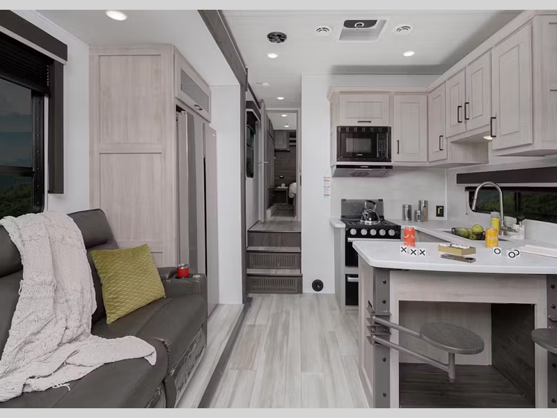 Sleeps 8 Slides 2 Length 44 ft 11 in Ext Width 8 ft 4 in Ext Height 13 ft 3 in Interior Color Charcoal, Stone Hitch Weight 2885 lbs Dry Weight 14305 lbs Cargo Capacity 3695 lbs Fresh Water Capacity 94 gals Grey Water Capacity 88 gals Black Water Capacity 88 gals Tire Size ST235/80R16G Furnace BTU 35000 btu Fuel Capacity 30 gals Number Of Bunks 1 Available Beds RV Queen Refrigerator Type 12V Refrigerator Size 16 cu ft Cooktop Burners 3 Number of Awnings 1 Axle Weight 7000 lbs Garage Size 15 ft LP Tank Capacity 30 lbs Water Heater Type Girard On Demand TV Info LR Smart TV Awning Info 20' Electric with Adjustable Arms, Auto Dump, LED Light Strip Axle Count 2 Number of LP Tanks 2 Shower Type Standard Electrical Service 50 amp Similar Floorplans