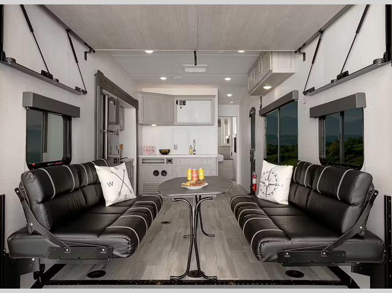 Sleeps 6 Slides 1 Length 33 ft 5 in Ext Width 8 ft 4 in Ext Height 12 ft 5 in Interior Color Charcoal, Stone Hitch Weight 1175 lbs Dry Weight 7602 lbs Cargo Capacity 3698 lbs Fresh Water Capacity 54 gals Grey Water Capacity 30 gals Black Water Capacity 30 gals Tire Size ST225/75R15E Furnace BTU 35000 btu Fuel Capacity 30 gals Number Of Bunks 1 Available Beds RV Queen Refrigerator Type 12V Refrigerator Size 10 cu ft Cooktop Burners 3 Number of Awnings 1 Axle Weight 5100 lbs Garage Size 15 ft LP Tank Capacity 30 lbs Water Heater Type Girard On Demand Awning Info 18' Electric with Adjustable Arms, Auto Dump, LED Lights Axle Count 2 Number of LP Tanks 2 Shower Type Tub/Shower Combo Electrical Service 50 amp Similar Floorplans