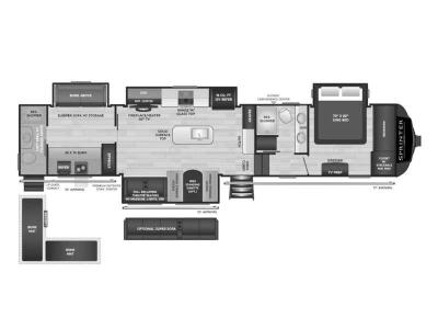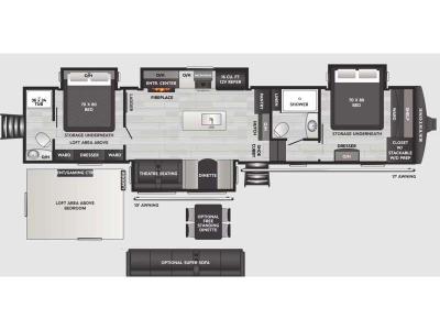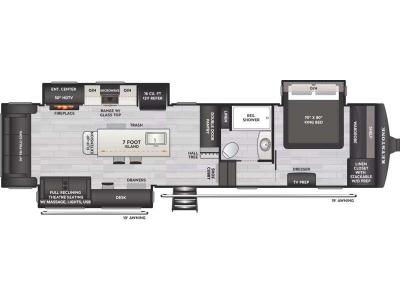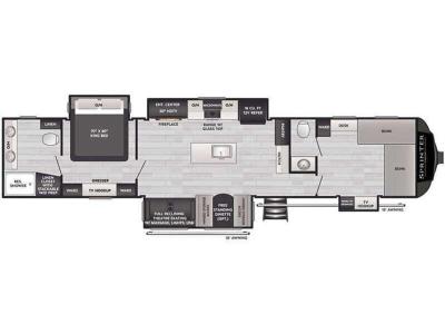 You will find residential style seamless marbled countertops, Dyna Span marine grade decking, residential style screwed and glued cabinetry, and designer upholstered window valances to make you feel right at home. The MaxTurn technology with Road Armor will make for smooth towing and the automotive-grade painted fiberglass front cap includes KeyShield protection for added convenience.
