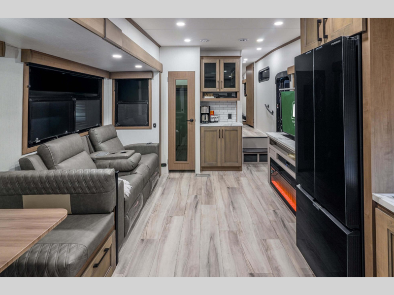 Sleeps 10 Slides 2 Length 33 ft 7 in Ext Width 8 ft Ext Height 12 ft 5 in Interior Color Mink, Pebble Exterior Color Polar White Hitch Weight 1650 lbs GVWR 11500 lbs Dry Weight 9400 lbs Cargo Capacity 2100 lbs Fresh Water Capacity 55 gals Grey Water Capacity 90 gals Black Water Capacity 50 gals Tire Size 16" Furnace BTU 35000 btu Number Of Bunks 2 Available Beds Queen Refrigerator Type French Door Style Refrigerator Size 12 cu ft Cooktop Burners 3 Shower Size 30" x 36" Number of Awnings 2 Axle Weight 7750 lbs LP Tank Capacity 30 lbs Water Heater Type On Demand Tankless AC BTU 15000 btu TV Info LR 43" Smart LED TV Awning Info 11' and 17' Electric with LED Lights Axle Count 2 Washer/Dryer Available Yes Number of LP Tanks 2 Shower Type Standard Electrical Service 50 amp Similar Floorplans