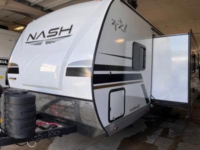With any Nash travel trailer by Northwood, you can be sure you're getting a durable RV made to last thanks to the fully welded, thick-wall aluminum frame construction and Northwood built Ironhorse chassis. There are also thermal pane windows, Corona treated fiberglass, and all-conditions/four seasons insulation so you can camp in any weather! A pass-through storage with an LED light will let you easily store camp gear and the SolX 4 - 400-Watt Solar Package will provide some off-grid capabilities. Head inside to enjoy the cathedral arched ceiling, along with slow rise night shades, a Northwood TruRest mattress, an AM/FM stereo with Bluetooth, and many more at-home comforts. The optional Off the Grid Package can be added to any Nash model and includes custom OTG graphics, a SolX 6 Solar Package, a rear LED light bar, off-road tires, and more upgraded features!