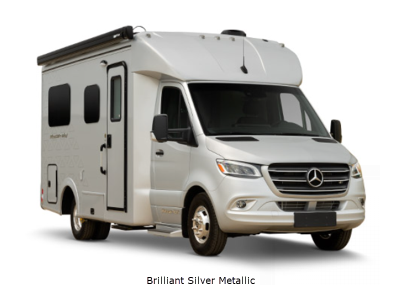 Sleeps 3 Length 22 ft 9 in Ext Width 9 ft 2 in Ext Height 10 ft 7 in Int Height 6 ft 8 in Interior Color Cashmere, Flint Exterior Color Brilliant Silver Metallic Hitch Weight 4220 lbs GVWR 11030 lbs Cargo Capacity 4220 lbs Fresh Water Capacity 28 gals Grey Water Capacity 20.4 gals Black Water Capacity 17.4 gals Tire Size LT215/85 R16 Furnace BTU 11500 btu Generator 2.5 KW Onan QG 2500i LP Fuel Type Diesel Engine 4-Cylinder OM 654 High Output Chassis Mercedes-Benz Sprinter 3500 Horsepower 211 hp Fuel Capacity 26 gals Wheelbase 170 in Refrigerator Type 12V Norcold Refrigerator Size 5.3 cu ft Cooktop Burners 1 Shower Size 32" Number of Awnings 1 Axle Weight Front 4410 lbs Axle Weight Rear 7720 lbs Water Heater Type Truma AquaGo Comfort Plus AC BTU 13500 btu TV Info LR 24" Smart LED TV Awning Info Fiamma Power w/ LED Lights Gross Combined Weight 15250 lbs Shower Type Radius Electrical Service 30 amp