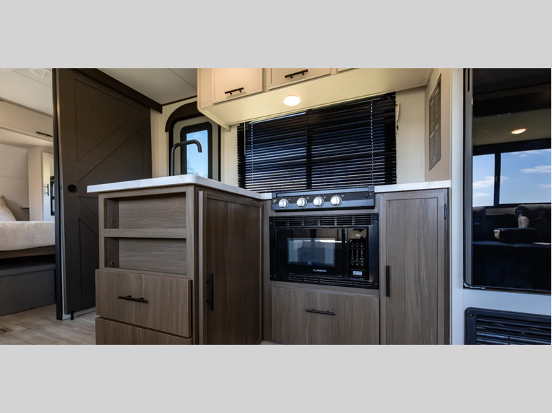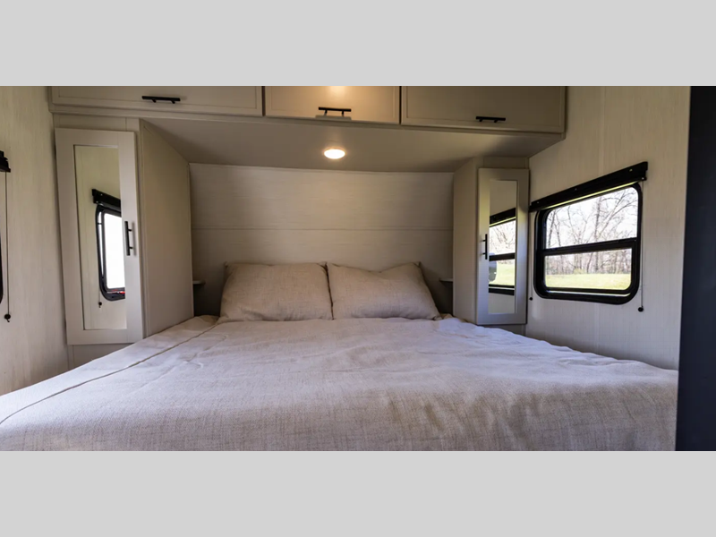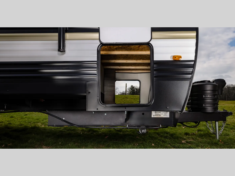 Each model is constructed with a fully enclosed underbelly, a PVC roof membrane, and gold reflective exterior windows that are sure to be eye-catching. The power tongue jack and power stabilizer jacks will have you set up in no-time, and the best-in-class drop frame pass-through storage means you can bring along extra camp gear. Inside, you'll find Congoleum flooring, seamless pressed countertops, a designer bedding package, and many more comforts.