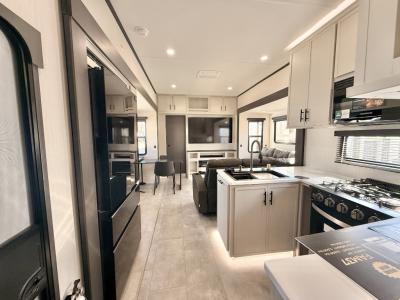 If you enjoy long trips with family and friends, this fifth wheel is sure to meet all of your needs! There is a private bedroom with a king bed slide-out  for more space and comfort, plus a front wardrobe. And you will be amazed by the lovely full bathroom behind the barn door next to the bedroom with a double vanity for you and your partner! The living room is made spacious thanks to the dual opposing slides, and you'll find a sectional sleeper sofa here, as well as desk/dinette for meals and even work. And don't overlook the kitchen area with ample counter space, a four burner range, an accessory sink and a French door 12V refrigerator! If you thought it can´t get better, wait until you see the front room that will be the best place to relax and hang out, featuring a sleeper sofa, bunks above, and an entertainment center with a projector for a movie marathon.