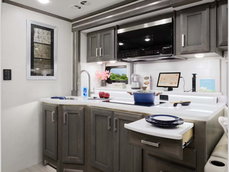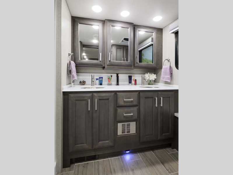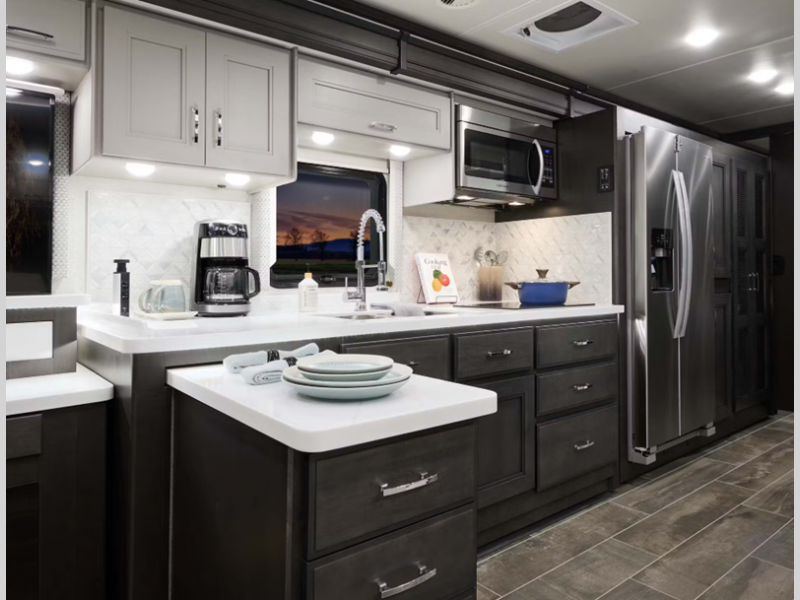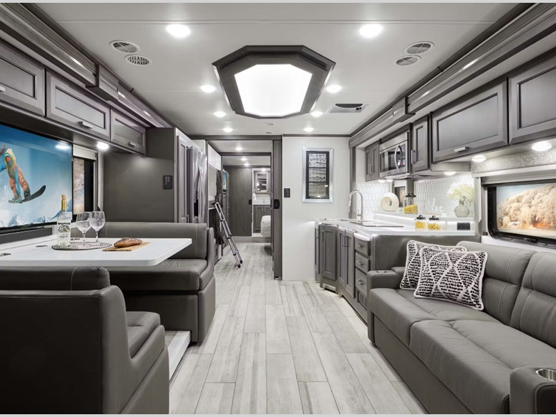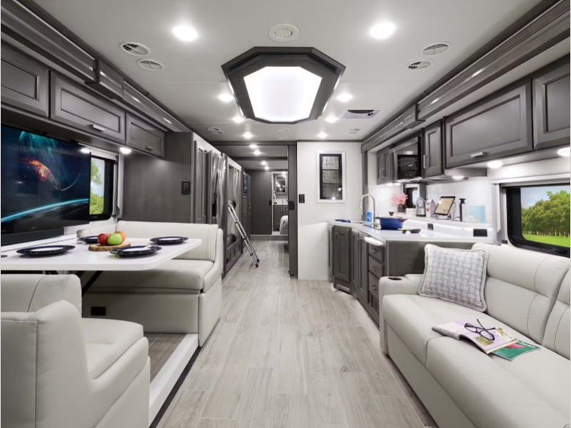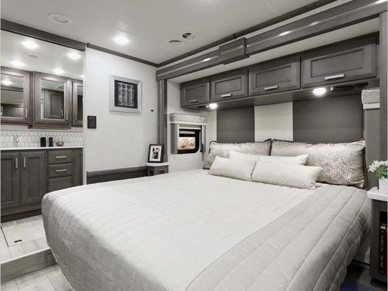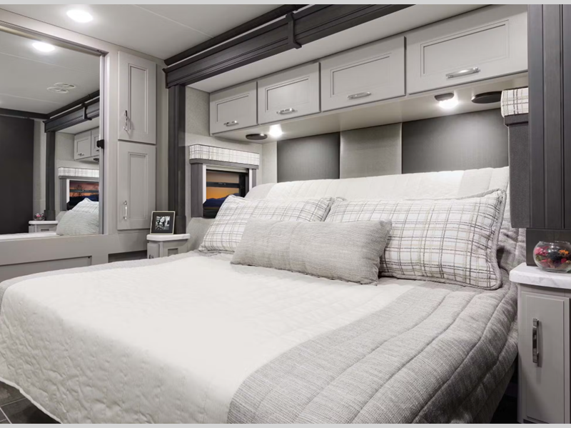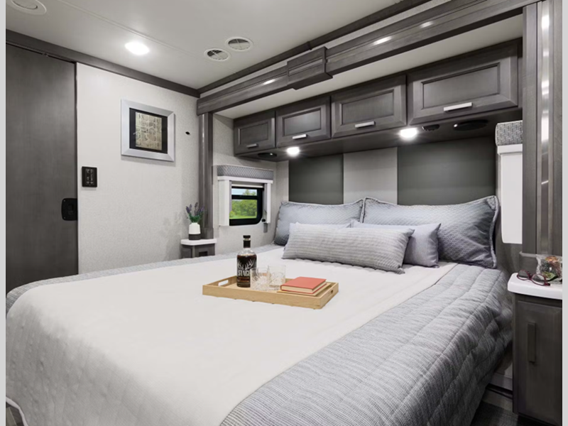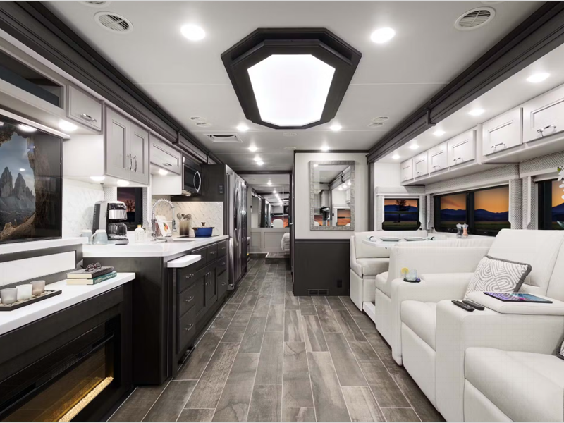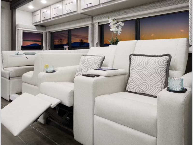Each coach is hand-built on a Freightliner XC-R raised rail chassis with an Atlas Foundation, and includes Air-Ride suspension and Sachs shock absorbers for a smooth ride, and the VFS front axle with a 55-degree wheel cut improves handling so you can enjoy driving in the city just as much as on the highways. The list of standard features continues with the RapidCamp+ Multiplex wiring control system with a 7-inch screen, polished porcelain tile flooring, and dual roof air conditioners with heat pumps to keep the inside comfortable.