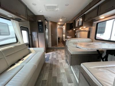 Experience a smooth ride to each destination with the Thor Motor Coach Chateau Class C gas motorhomes! There is a Ford E-Series chassis or optional Chevrolet chassis on select models, and each model includes an 8,000 lb. trailer hitch to bring the family car along. They are constructed with a welded tubular aluminum roof, sidewall cage construction, vacu-bond laminated roof, walls, and floor with block foam insulation to keep the heat and air conditioning inside. The slick fiberglass exterior with graphics package and black framed windows are sure to turn heads down the highway too. Inside, you'll be met with residential vinyl flooring, window privacy shades on select models, a power bath vent, and pressed laminate kitchen countertops. There is even a tankless water heater for endless hot showers, a 4.0 kw gas generator to keep you going, and solar prep for off-grid capabilities!