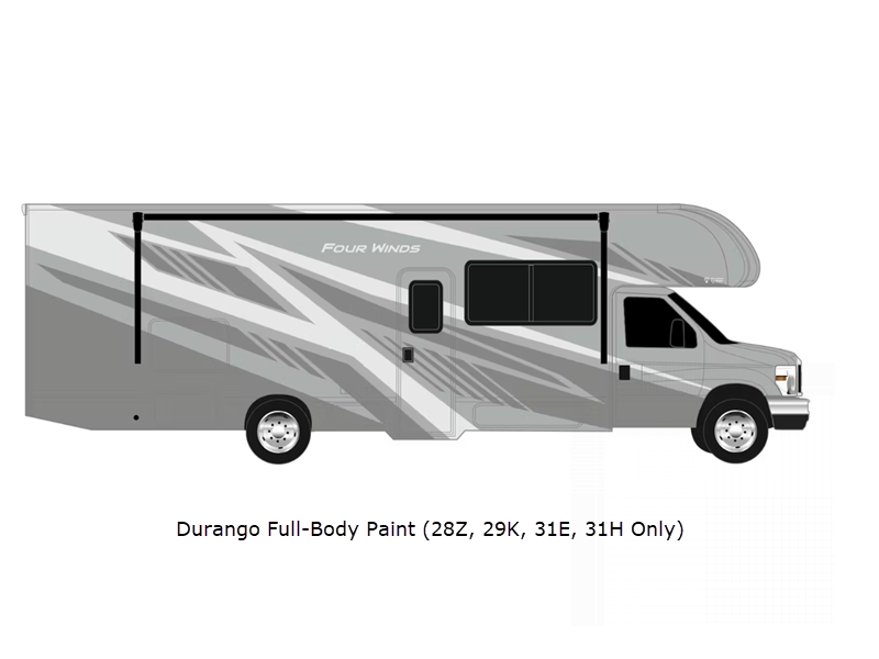 Sleeps 5 Slides 1 Length 31 ft Ext Width 8 ft 3 in Ext Height 11 ft 2 in Int Height 7 ft Interior Color Nantucket Blue ll, Sunlit Silver Exterior Color Standard Graphics. Optional Full-Body Paint; Durango, Telluride Hitch Weight 8000 lbs GVWR 14500 lbs Fresh Water Capacity 40 gals Grey Water Capacity 35 gals Black Water Capacity 34.5 gals Furnace BTU 30000 btu Generator 4.0 kW Gas Fuel Type Gasoline Engine 7.3L V8 Chassis Ford E Series Horsepower 325 hp Fuel Capacity 55 gals Wheelbase 158 in Number Of Bunks 1 Available Beds RV King Torque 450 ft-lb Refrigerator Type 12V w/Auto Generator Start Cooktop Burners 3 Shower Size 30" x 36" Number of Awnings 1 LP Tank Capacity 40.9 lbs Water Heater Type Tankless AC BTU 15000 btu Basement Storage 50.4 cu. ft. TV Info Cab 40" Smart TV Awning Info 18' Power w/Integrated LED Lighting Washer/Dryer Available Yes Gross Combined Weight 22000 lbs Shower Type Standard Electrical Service 30 amp Solar Wattage 100 watts Similar Floorplans