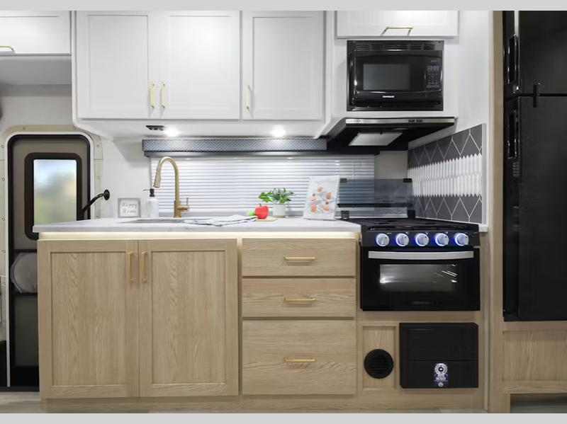 Sleeps 5 Slides 1 Length 24 ft 1 in Ext Width 8 ft 3 in Ext Height 11 ft Int Height 7 ft Interior Color Nantucket Blue ll, Sunlit Silver Exterior Color Standard Graphics Hitch Weight 8000 lbs GVWR 12500 lbs Fresh Water Capacity 40 gals Grey Water Capacity 35 gals Black Water Capacity 30 gals Furnace BTU 19000 btu Generator 4.0 kW Gas Dual Gas/LP Fuel Type Gas Engine 7.3L V8 Chassis Ford E-Series Horsepower 325 hp Fuel Capacity 55 gals Wheelbase 158 in Number Of Bunks 1 Available Beds RV Queen Torque 450 ft-lb Refrigerator Type 12V Convection Cooking Yes Cooktop Burners 2 Shower Size 24" x 36" Number of Awnings 1 LP Tank Capacity 40.9 lbs Water Heater Type Tankless AC BTU 13500 btu Basement Storage 30.9 cu. ft. TV Info Cab 32" Smart TV Awning Info 15' Power w/Integrated LED Lighting Gross Combined Weight 18500 lbs Shower Type Standard Electrical Service 30 amp Similar Floorplans