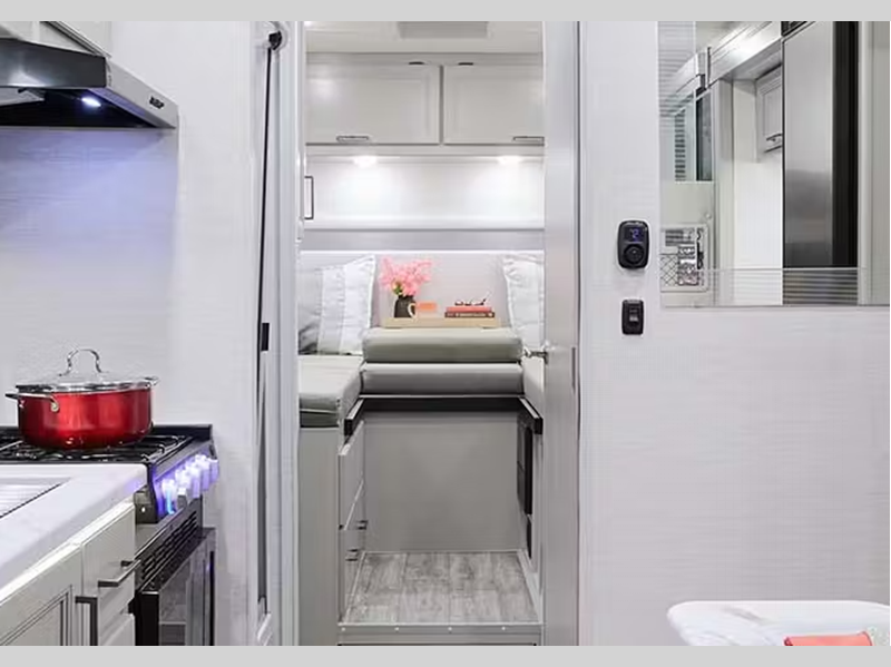 Sleeps 4 Slides 1 Length 25 ft 10 in Ext Width 7 ft 6 in Ext Height 11 ft 8 in Int Height 7 ft Interior Color Sunlit Silver, Nantucket Blue ll Exterior Color Standard Graphics. Optional Partial Paint; Raven Edition lll, Moonlit Edition lll Hitch Weight 5000 lbs GVWR 12125 lbs Fresh Water Capacity 30 gals Grey Water Capacity 37 gals Black Water Capacity 30 gals Furnace BTU 19000 btu Generator 50 State 4.0 kW LP Fuel Type Diesel Engine 2.0L I-4 Chassis Mercedes Benz Sprinter Horsepower 211 hp Fuel Capacity 24.5 gals Wheelbase 170.3 in Number Of Bunks 1 Available Beds Twin Beds with King Conversion Torque 332 ft-lb Refrigerator Type 12V with Auto Generator Start Convection Cooking Yes Cooktop Burners 3 Shower Size 24" x 32" Number of Awnings 1 LP Tank Capacity 40.9 lbs. Water Heater Type Tankless AC BTU 15000 btu Basement Storage 78.2 cu. ft. TV Info 32" Smart TV over Entry Door Awning Info 16' 6" Power w/LED Lights Gross Combined Weight 15250 lbs Shower Type Standard Electrical Service 30 amp Similar Floorplans