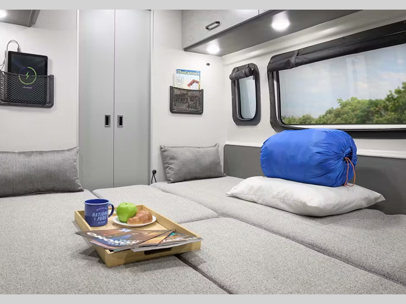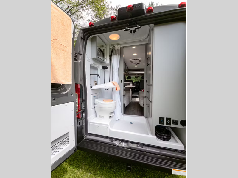Sleeps 2 Length 21 ft 1 in Ext Width 6 ft 9 in Ext Height 9 ft 5 in Int Height 6 ft 3 in Interior Color Modern White Exterior Color Full Body Paint; Silver, White. Ceramic Gray Hitch Weight 5000 lbs GVWR 9350 lbs Fresh Water Capacity 27 gals Grey Water Capacity 13 gals Black Water Capacity 13.5 gals Furnace BTU 14300 btu Generator 2800 Gas Fuel Type Gasoline Engine 3.6L Pentastar V6 Chassis RAM ProMaster 3500 XT Horsepower 276 hp Fuel Capacity 24 gals Wheelbase 159 in Available Beds Two Twin Torque 250 ft-lb Refrigerator Type Single Door 12V Cooktop Burners 1 Number of Awnings 1 LP Tank Capacity 24.78 lbs. Water Heater Capacity 2.64 gal Water Heater Type Combi Eco LP AC BTU 11000 btu TV Info LR 24" Smart TV Awning Info 12' Thule Lateral Arm Power w/Integrated LED Lighting Gross Combined Weight 11500 lbs Shower Type Wet/Bath Shower Electrical Service 30 amp Similar Floorplans