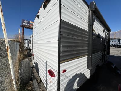 Camping with a group has never been easier than in this travel trailer with bunk beds! You will enjoy the bed up front and there is a wardrobe nearby to keep your clothes tidy. This model also includes a booth dinette slide that will be perfect for meal times, game night, and even sleeping space for one to two people. Whip up some eggs and bacon on the two burner cooktop or in the microwave oven before you head out for the day. The full bath with a tub/shower will be perfect if you're camping with little ones, and there is plenty of counterspace to set out your bathroom necessities.