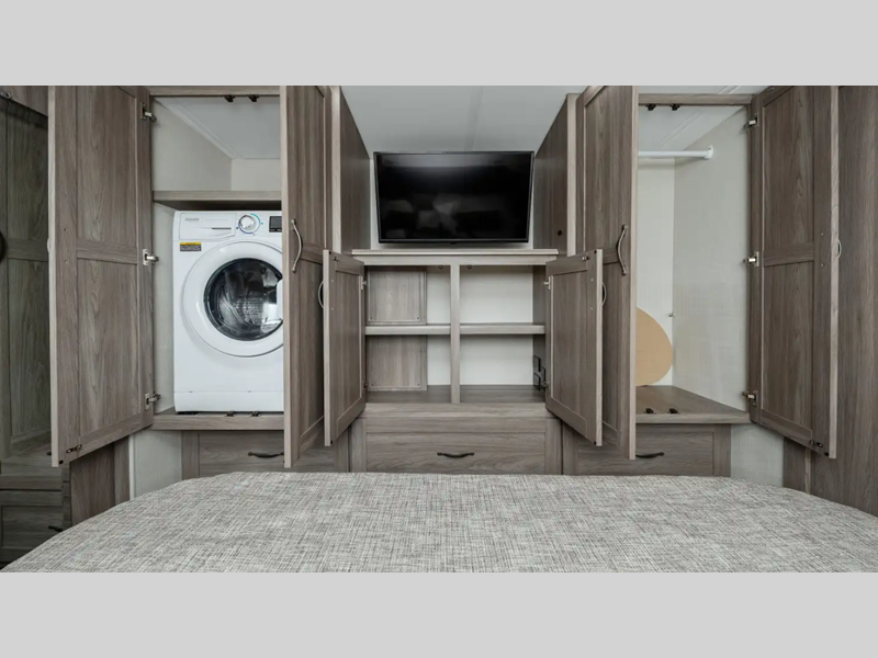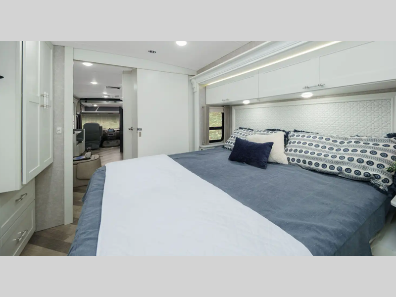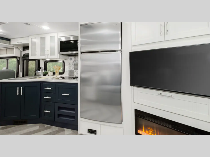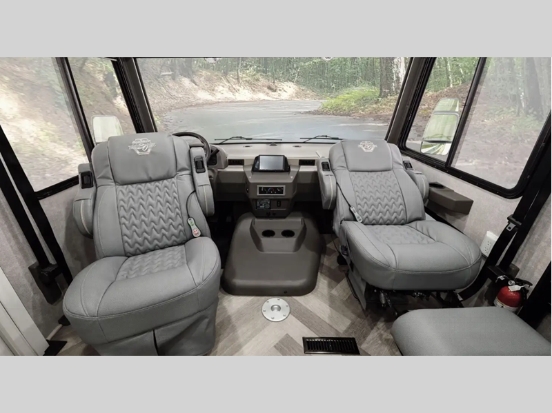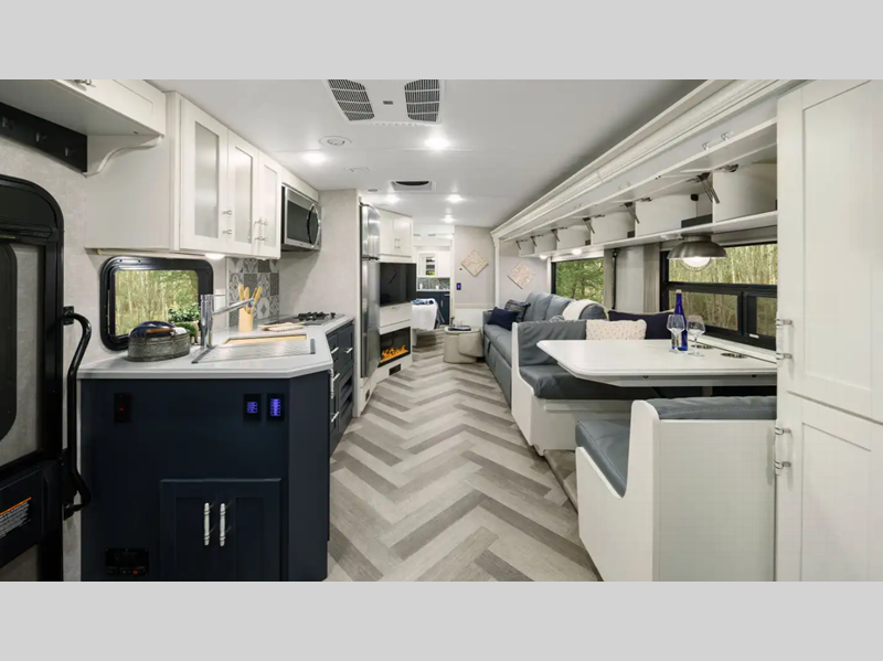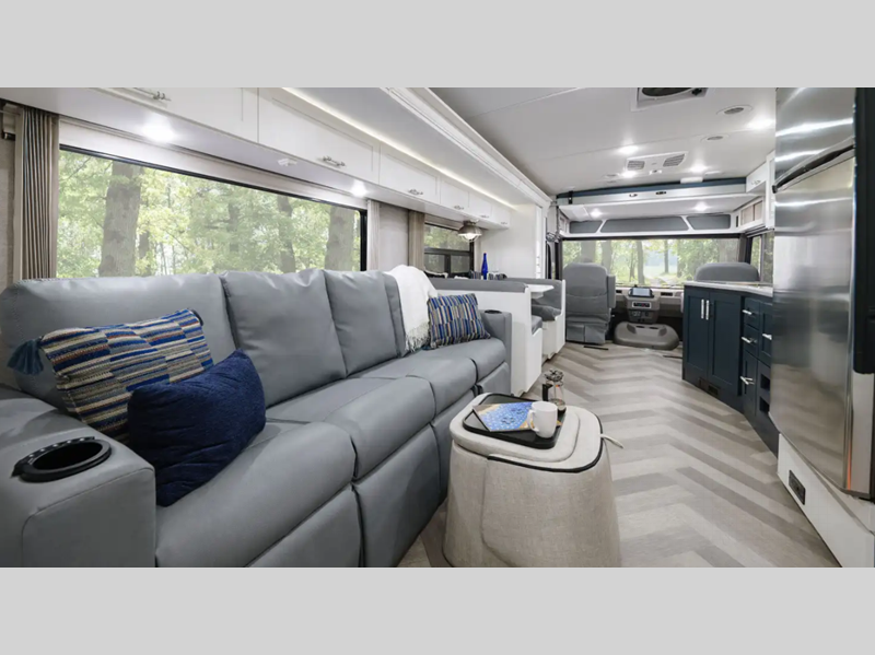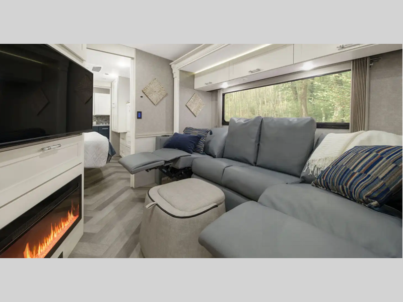 Sleeps 5 Slides 2 Length 35 ft 10 in Ext Width 8 ft 6 in Ext Height 12 ft 1 in Int Height 6 ft 10 in Interior Color Organic Comfort Dark, Organic Comfort Light, Bohemian Oasis Exterior Color Full-Body Paint; Silvermist, Wedgewood ll, Steel Grey, Night Sky Hitch Weight 5000 lbs GVWR 22000 lbs Fresh Water Capacity 74 gals Grey Water Capacity 51 gals Black Water Capacity 63 gals Tire Size 22.5" Furnace BTU 40000 btu Generator 5,500-Watt Cummins Onan Marquis Gold Fuel Type Gas Engine 7.3L V8 Chassis Ford F53 Fuel Capacity 80 gals Wheelbase 228 in Available Beds King Refrigerator Type Stainless Steel Residential with Ice Maker and Water Dispenser Convection Cooking Yes Cooktop Burners 3 Shower Size 36" x 36" Number of Awnings 1 Axle Weight Front 8000 lbs Axle Weight Rear 15000 lbs LP Tank Capacity 76.14 lbs Water Heater Capacity 10 gal Water Heater Type 110V/LP AC BTU 28500 btu Basement Storage 137 cu. ft. TV Info LR 39" HDTV, BR 32" HDTV, Ext. 32" HDTV Awning Info 16' Power w/LED Lighting Washer/Dryer Available Yes Gross Combined Weight 26000 lbs Shower Type Standard Electrical Service 50 amp Similar Floorplans