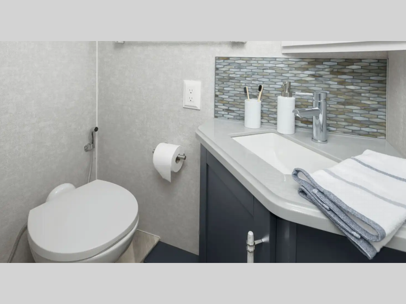 - Service center color-coded labels, pressurized city water hookup w/diverter valve, drainage valves, 10' sewer hose, QuickPort® service connection hatch, exterior wash station w/lighted pump switch, sewage pump macerator