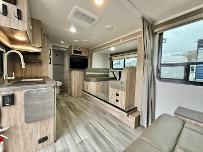 If you're looking for versatility then you need this travel trailer! Depending on the time of day you enter will determine whether you see the Murphy bed or the sofa up front. A slide out 44" x 72" booth dinette can be used for dining, playing games, and sleeping space at night. The full rear bathroom is equipped with everything you will need to freshen up each morning and features a wardrobe for your clothing and linens, and a pocket door into the bath saves space in the main room. The Smart TV is conveniently located so you can watch your favorite shows from the sofa or Murphy bed as well as the dinette, plus the pantry offers a place to store your snacks and such for easy access. The cook in your bunch will love all the amenities to make meals including the handy flip-up counter for more prep space.